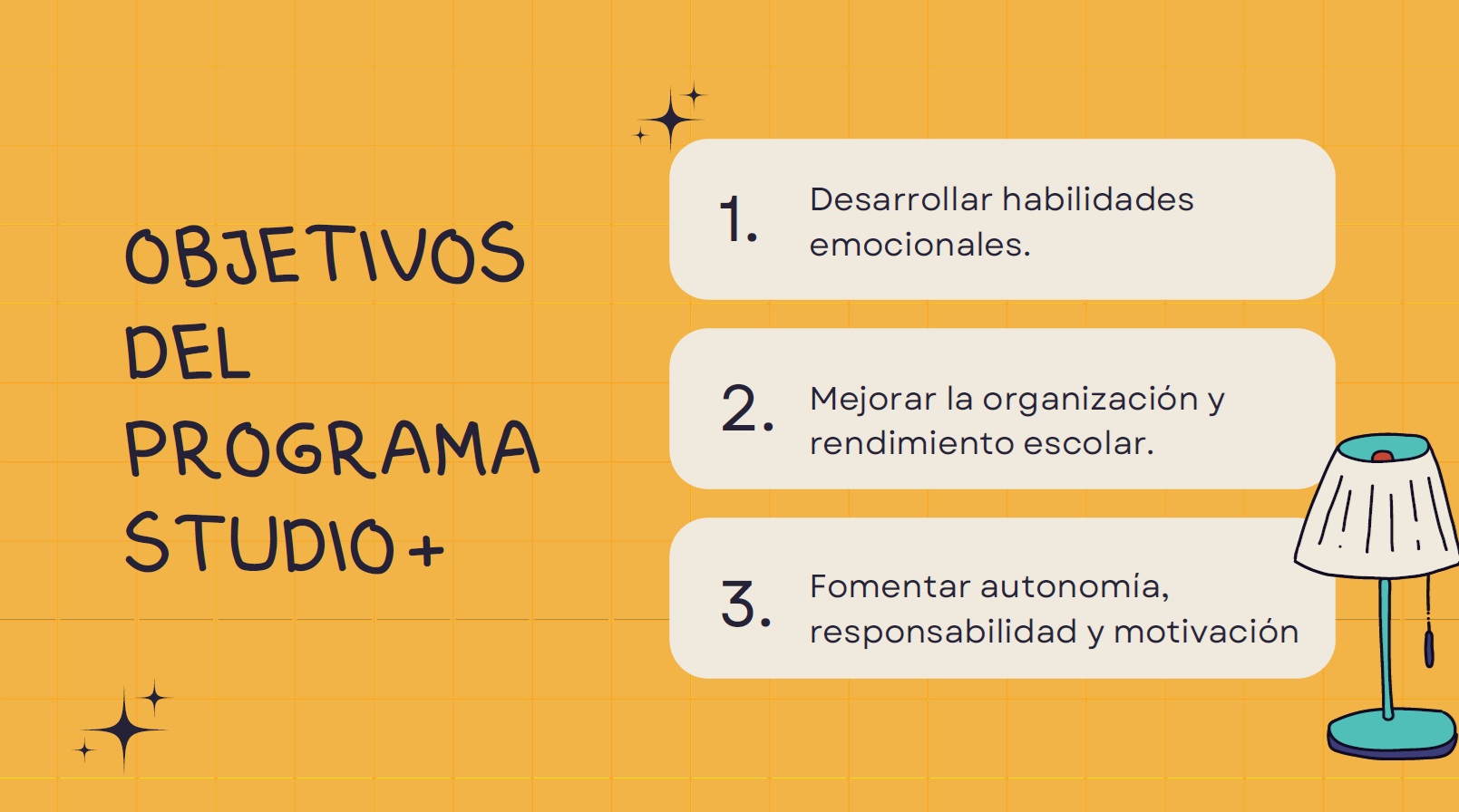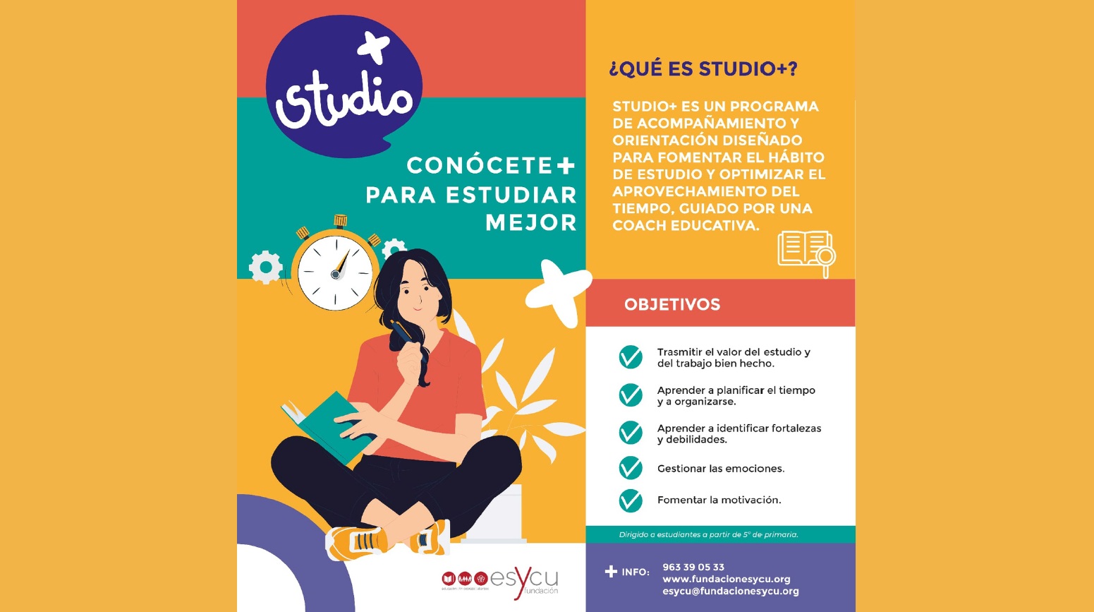 Studio + es un programa de acompañamiento y orientación diseñado por la Fundación Esycu, para fomentar el hábito de estudio y optimizar el aprovechamiento del tiempo. El proyecto de estudio se complementa con un programa de inteligencia emocional. Uno de los principales objetivos es el autoconocimiento junto con la gestión de las emociones y todo ello orientado a proporcionar herramientas para estudiar mejor.